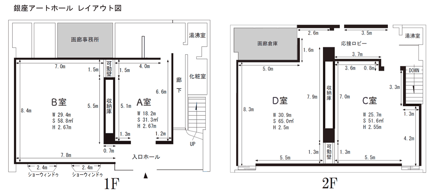 2つのショーウインドウから外光の差し込む約60㎡人気会場を中心に4つの展示場を持ち、総面積が206.7㎡の大型画廊です。1階と2階を合わせて4つのスペースは組み合わせてご利用になれます。